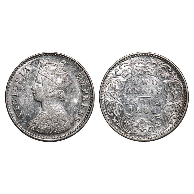 | Victoria Empress, Silver, 2 Annas, 1884, Bombay Mint, A/I, No dot, Die crack on Obv, Mechanical die doubling on jabot at Obv. F. Prid 531. GK 769. Uncirculated. Rare. |