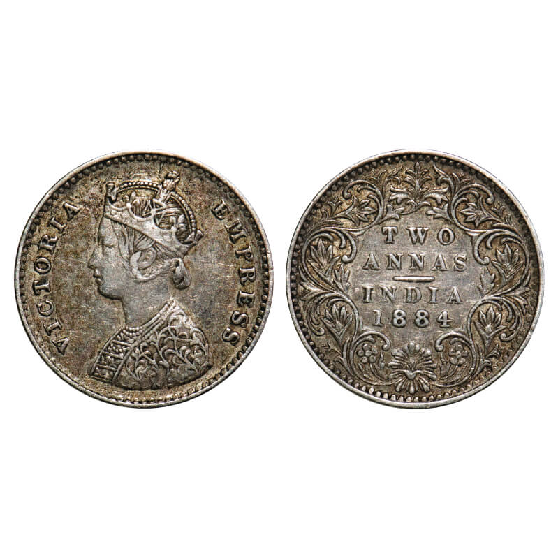 Victoria Empress, Silver, 2 Annas, 1884, Bombay Mint, A/I, No dot. F. Prid 531. GK 769. Very Fine+. Scarce.