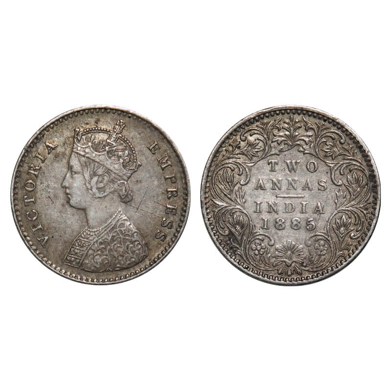 Victoria Empress, Silver, 2 Annas, 1885, Bombay Mint, A/I, No mint mark, No 'B'. F. Prid. GK 776. Extremely Fine. Very Scarce.