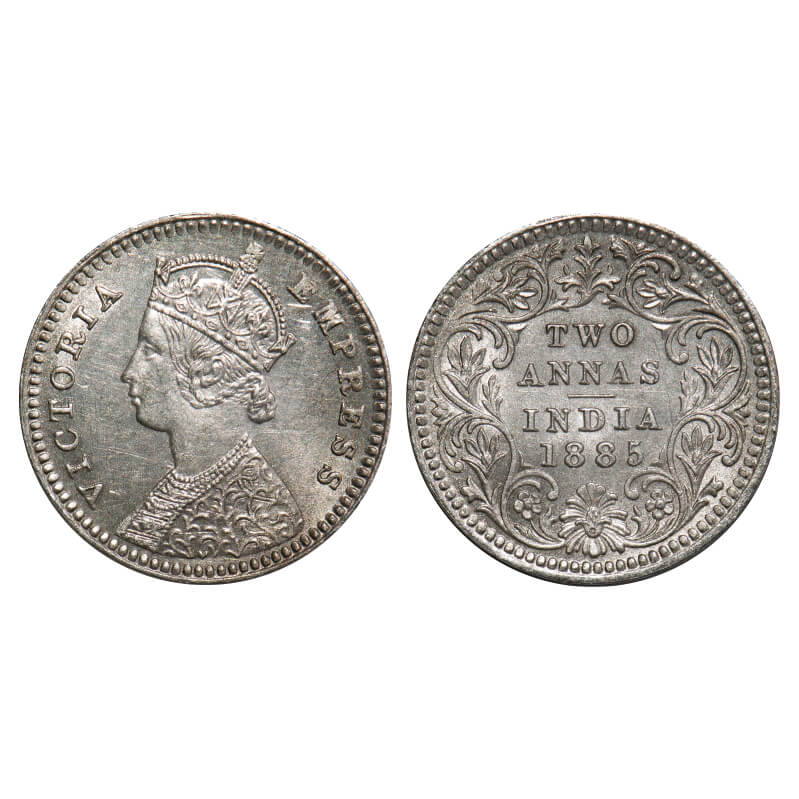 Victoria Empress, Silver, 2 Annas, 1885, Calcutta Mint, B/II, 'C' incused. F. Prid 500. GK 779. Uncirculated. Rare.