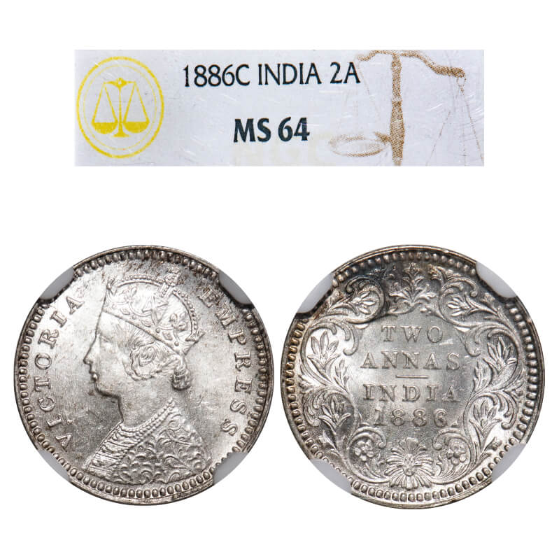 Victoria Empress, Silver, 2 Annas, 1886, Calcutta Mint, B/II, 'C' incused. F. Prid 501. GK 782. NGC Slabbed MS 64. Extremely Rare.