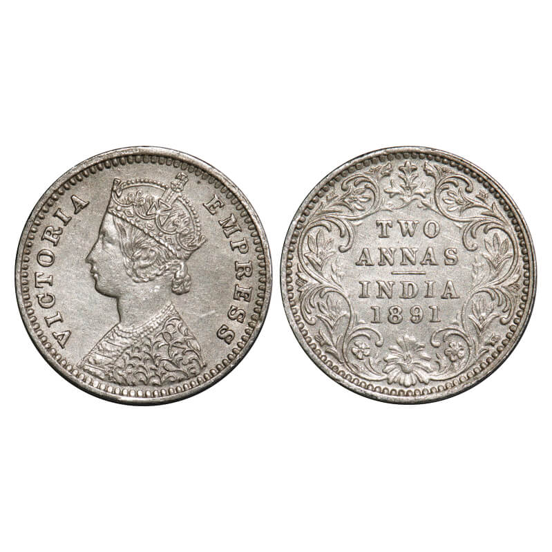 Victoria Empress, Silver, 2 Annas, 1891, Bombay Mint, B/II, 'B' incused. F. Prid 546. GK 794. Uncirculated. Rare.