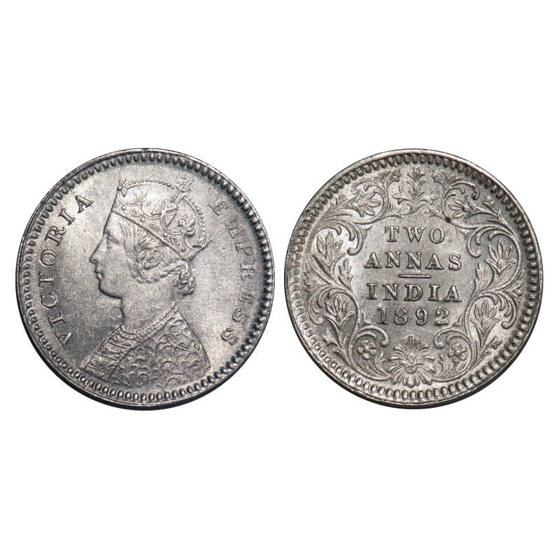 Victoria Empress, Silver, 2 Annas, 1892, Calcutta Mint, B/II, 'C' incused, Ghost on Obv and Rev. F. Prid 507. GK 797. Uncirculated. Rare.