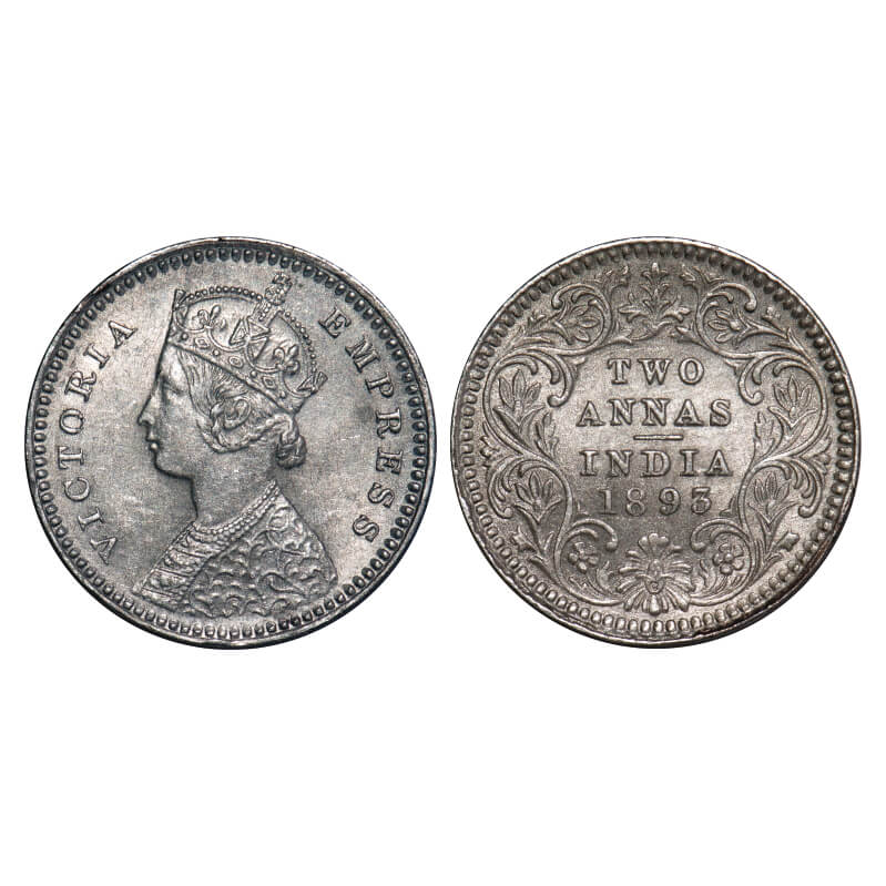 Victoria Empress, Silver, 2 Annas, 1893, Calcutta Mint, B/II, 'C' incused. F. Prid 508. GK 800. About Uncirculated. Very Scarce.