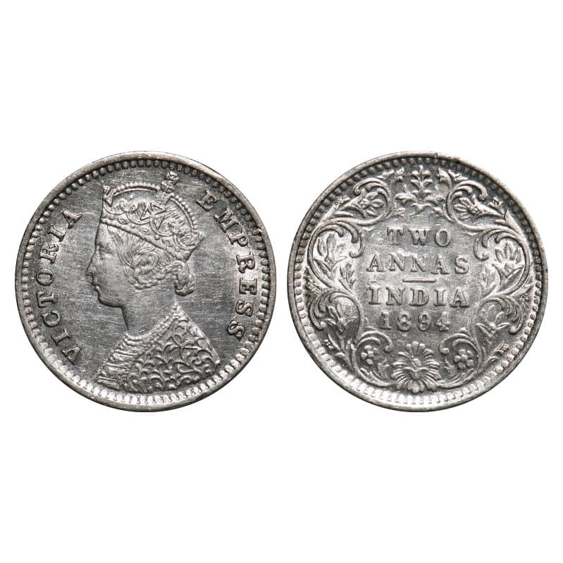 Victoria Empress, Silver, 2 Annas, 1894, Bombay Mint, B/II, 'B' incused. F. Prid 549. GK 801. Almost Uncirculated. Very Scarce.