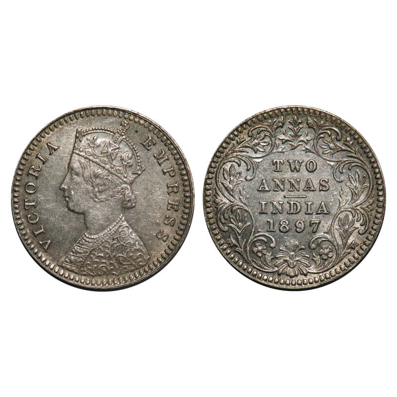Victoria Empress, Silver, 2 Annas, 1897, Calcutta Mint, B/II, 'C' incused, Ghost on Rev. F. Prid 512. GK 807. Extremely Fine+. Very Scarce.
