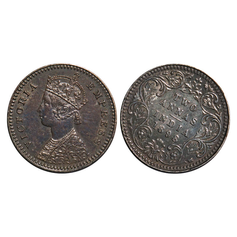 Victoria Empress, Silver, 2 Annas, 1898, Calcutta Mint, B/II, 'C' incused, 1'o clock on Rev. F. Prid 513. GK 810. Almost Uncirculated. Very Scarce.
