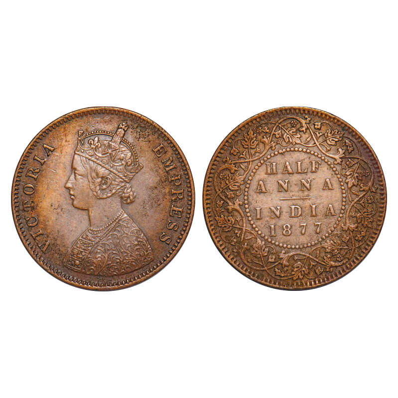 Victoria Empress, Copper, Half Anna, 1877, Bombay Mint, B/II, Narrow numeral 77. F. Prid 586. GK 820. Extremely Fine. Very Scarce.
