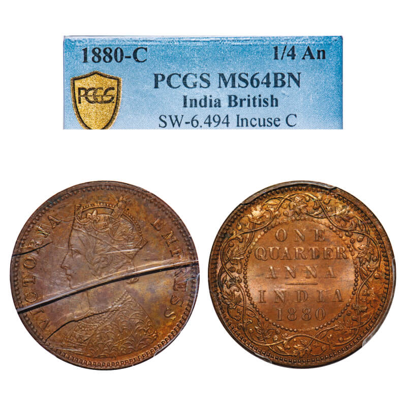 Victoria Empress, Copper, Quarter Anna, 1880, Calcutta Mint, B/II, 'C' incused, Crack on Obv side of the slab. F. Prid 614. GK 833. PCGS Slabbed MS 64 BN. Rare.