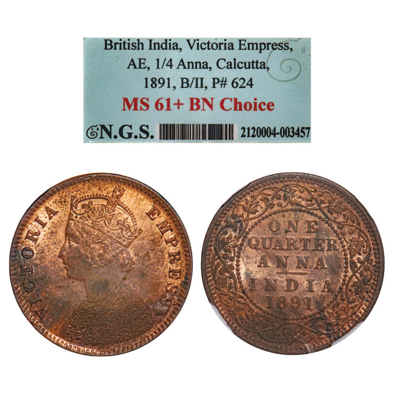 Victoria Empress, Copper, Quarter Anna, 1891, Calcutta Mint, B/II, No mint mark. F. Prid. 624. GK 850. NGS Slabbed MS 61+ BN Choice. Very Scarce.