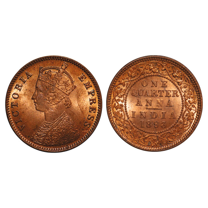 Victoria Empress, Copper, Quarter Anna, 1893, Calcutta Mint, B/II, No mint mark, Die crack on Rev. F. Prid 626. GK 852. Mint State. Rare.