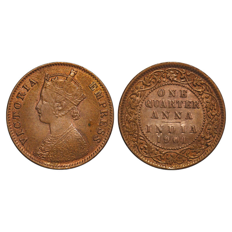 Victoria Empress, Copper, Quarter Anna, 1901, Calcutta Mint, B/II, No mint mark. F. Prid 634. GK 860. Almost Uncirculated. Scarce.