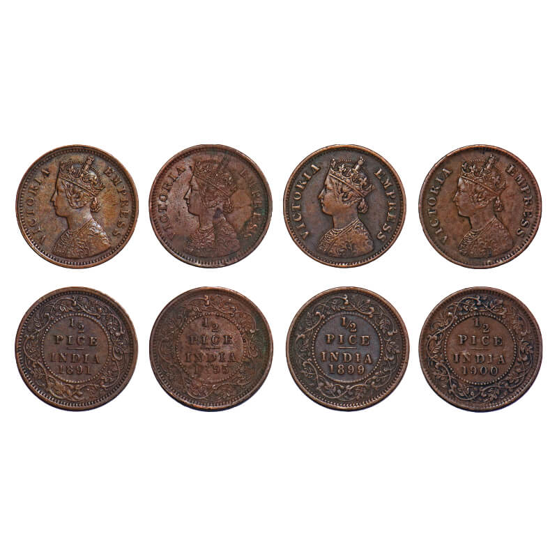 | Victoria Empress, Copper, 1/2 Pice, (4 coins), 1891, 1895, 1899, 1900, Calcutta Mint, A/I, No mint mark. F. Prid 723, 728, 732, 733. GK 871, 875, 879, 880. Very Fine to Very Fine+. Scarce. |