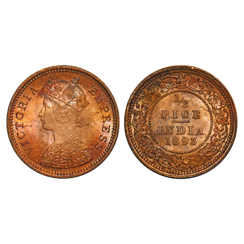 | Victoria Empress, Copper, 1/2 Pice, 1893, Calcutta Mint, A/I, No mint mark, Multiple die cracks on Obv, Ghost on Rev. F. Prid 726. GK 873. Mint State. Rare. |