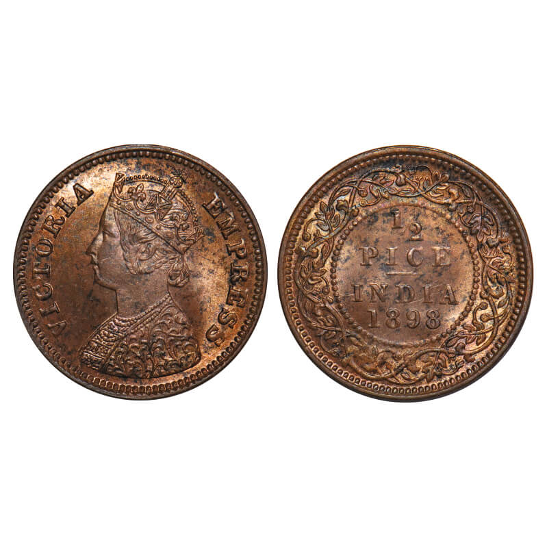Victoria Empress, Copper, 1/2 Pice, 1898, Calcutta Mint, A/I, No mint mark, Ghost on Rev. F. Prid 731. GK 878. Mint State. Very Rare.