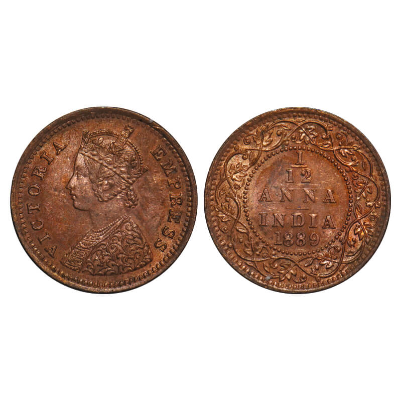 Victoria Empress, Copper, 1/12 Anna, 1889, Bombay Mint, Obv A, No mint mark. F. Prid 816. GK 909. Uncirculated, Very Scarce.