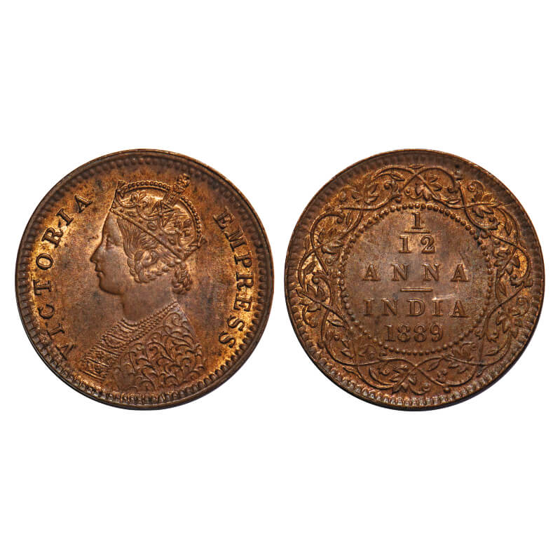 | Victoria Empress, Copper, 1/12 Anna, 1889, Calcutta Mint, Obv B, No mint mark, Ghost on Rev, The rim edge is thick besides 1/12 Anna. F. Prid 794. GK 910. Uncirculated. Very Scarce. |