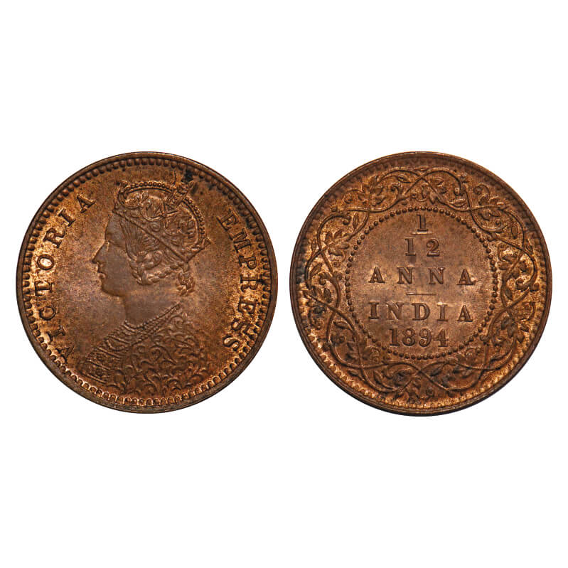 Victoria Empress, Copper, 1/12 Anna, 1894, Calcutta Mint, Obv B, No mint mark. F. Prid 799. GK 915. Uncirculated. Very Scarce.