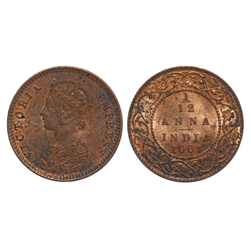 Victoria Empress, Copper, 1/12 Anna, 1901, Calcutta Mint, No mint mark, Obv B, Die cracks on Obv and Rev. F. Prid 805. GK 921. Brilliant Uncirculated. Very Scarce.