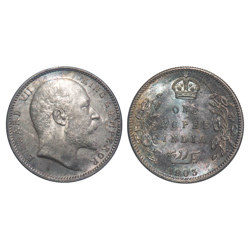 | Edward VII, Silver, Rupee, 1903, Calcutta Mint, No mint mark, Normal 5 Diamonds, Ghost on Rev. F. Prid 189. GK 924. Uncirculated, Rev Rainbow Toned. Very Scarce. |