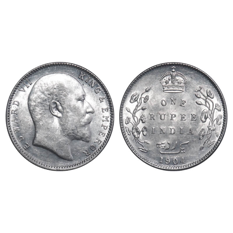 Edward VII, Silver, Rupee, 1904, Bombay Mint, 'B' incused and dot, 5 Diamonds and bottom stroke of numeral 4 long. F. Prid 200. GK 933. About Uncirculated. Very Scarce.