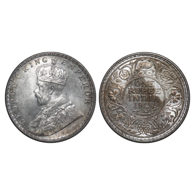 George V, Silver, Rupee, 1920, Calcutta Mint, No dot. F. Prid 216. GK 1041. Mint State, Rainbow Toned Rev. Rare.