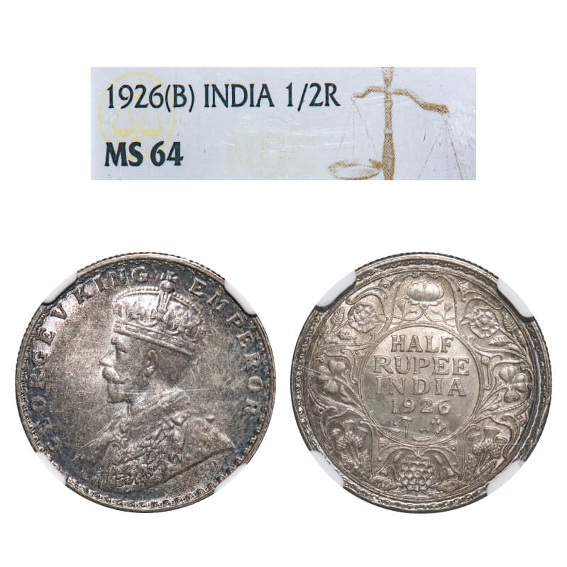 George V, Silver, Half Rupee, 1926, Bombay Mint, Dot. F. Prid 348. GK 1068. NGC Slabbed MS 64. Extremely Rare.
