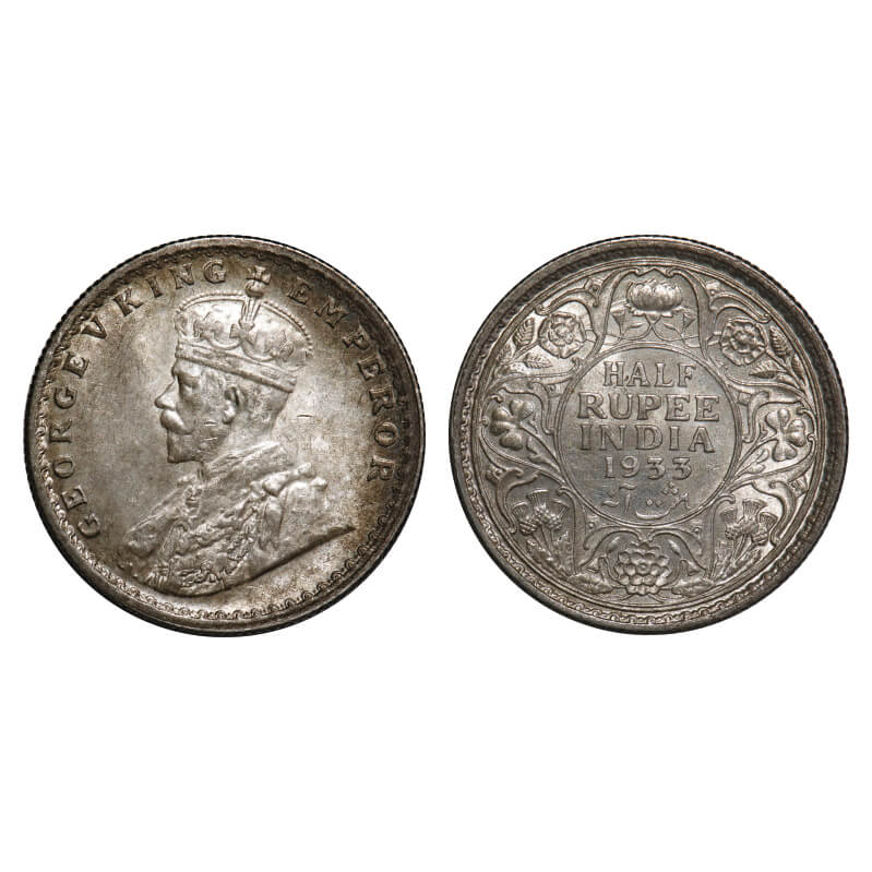 George V, Silver, Half Rupee, 1933, Calcutta Mint, No dot. F. Prid 333. GK 1073. About Uncirculated. Very Scarce.