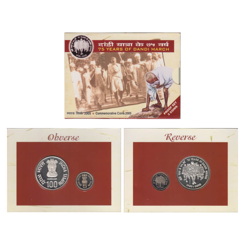 2007, Proof Set of 2 Coins, 100 & 5 Rupees, 75th year of Dandi March(1930-2005), Mumbai Mint. in original mint blister packing. S.Reddappa 23.48. Proof, Scarce.