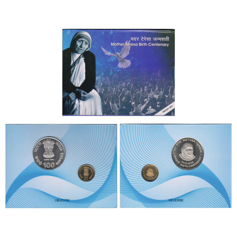 2010, Proof Coin Set of 2 Coins, 100 Rupees & 5 Rupees, Mother Teresa Birth Centenary, Kolkata Mint, in Blister packing. S.Reddappa 23.70. Proof, Scarce.