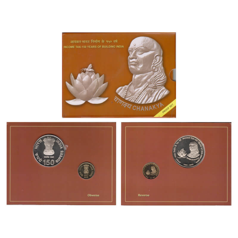 2011, Proof Set of 2 Coins, 100 & 5 Rupees, Income Tax 150 Years of Building India. Kolkata Mint, in original mint blister card packing. S.Reddappa 23.73. Proof, Scarce.