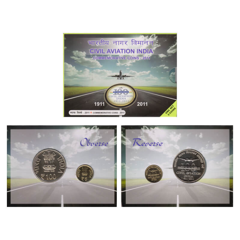 2011, Unc Set of 2 Coins, 100 & 5 Rupees, 100 Years of Civil Aviation India, Mumbai Mint. in original mint blister packing. S.Reddappa 25.72. Uncirculated, Scarce.