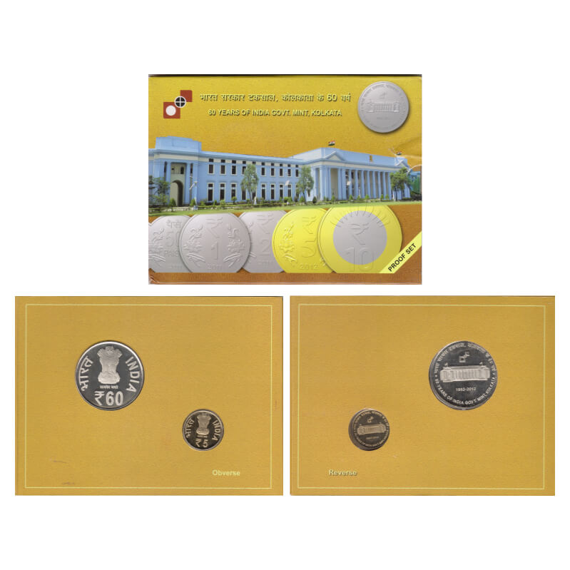 2012, Proof Coin Set of 2 Coins, 60 Rupees & 5 Rupees, 60 Years of India Govt. Mint, Kolkata Mint, in Blister packing. S.Reddappa 23.77. Proof, Scarce.
