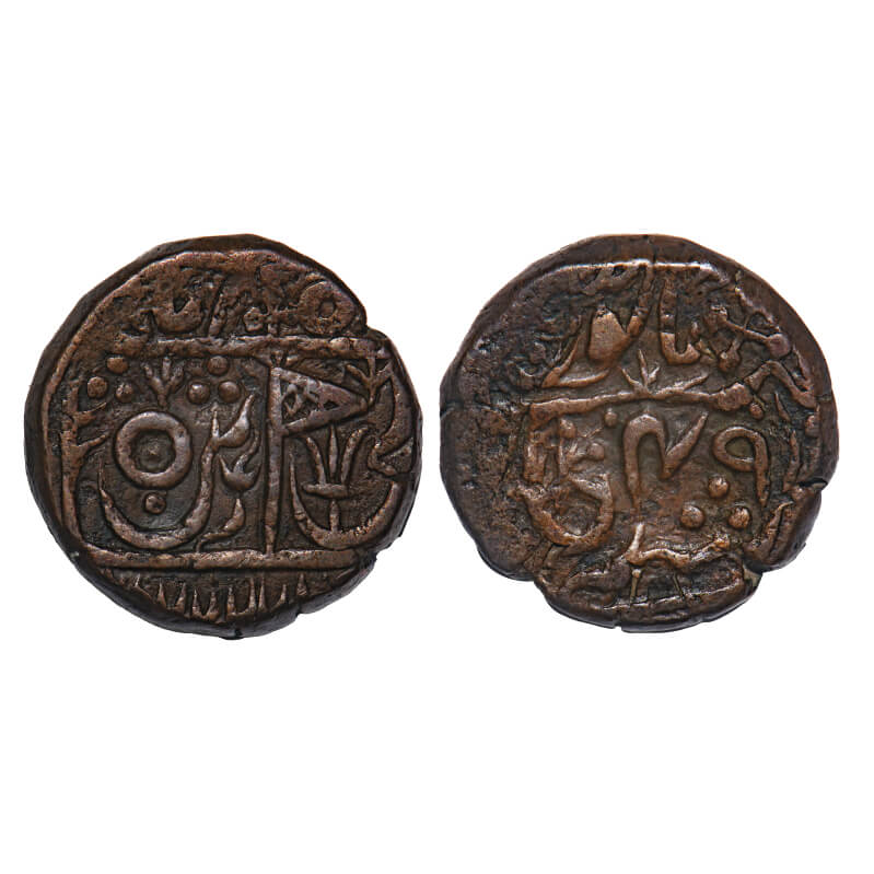 Maratha Confederacy, Copper Takka 15.46g, (Sagar), Ravish Nagar Sagar Mint, AH 1223/49 RY, INO Shah Alam II, trident, Flag and different flower having dot within circle mark. M&W T5b type. About Very Fine, Scarce. |