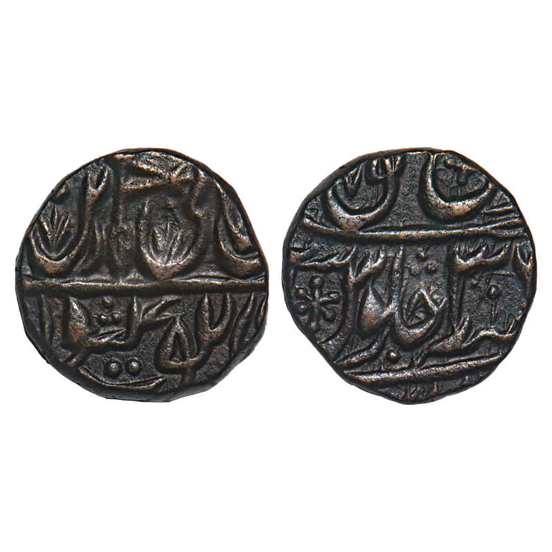 Maratha Confederacy, Copper ½ Paisa, 5.56g, (Sagar), Ravish Nagar Sagar Mint, 39 RY, INO Shah Alam II, Flag Pole mark. M&W Unlisted. Very Fine+, Rare. |