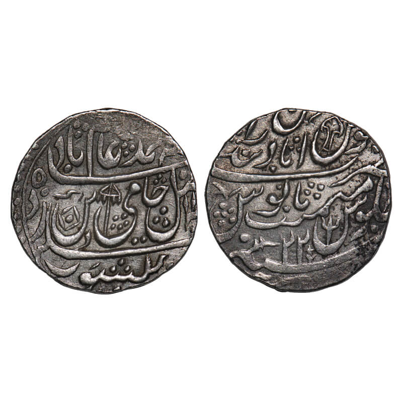 Maratha Confederacy, Silver Rupee, 11.17g, (Vrindaban) Muminabad Brindaban Mint (complete mint visible), AH 11xx/22 RY, INO Shah Alam II. Obv: Umbrela and different flower, Rev: Fish near 'ma' of mint, sword, trident, at bottom. M&W Unlisted date and type. Very Fine, Rare. |