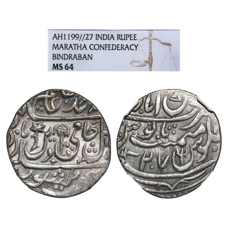 Maratha Confederacy, Silver Rupee, (Vrindavan) Muminabad Mint, INO Shah Alam II, 27 RY, Parasol and bud on obv., Fish on top in mint, dagger & trident' as mint mark on reverse. M&W T1/2a. NGC graded MS 64, Rare. |