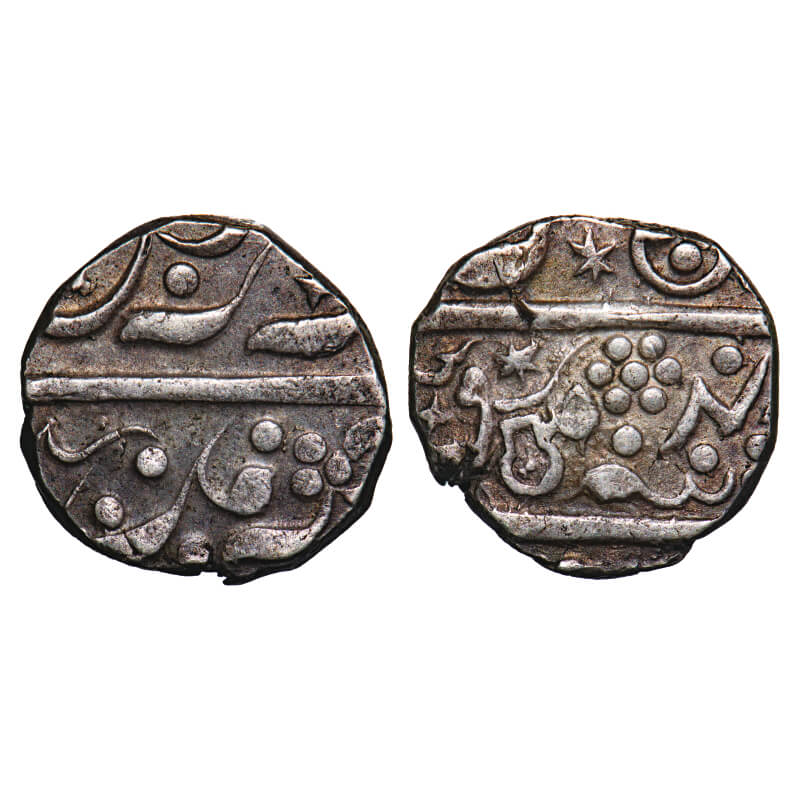 Maratha Confederacy, Silver ½ Rupee, 5.68g, (Sawantwadi) Wadi , 4x RY, INO Aurangzeb Alamgir, 2 star symbol, pelleted flower & shivalingam symbol as mint mark on rev. Princep attributes as Shambhu Pir Khani coins. MW Unatrributed T11a type. Extremely Fine, Very Rare. |