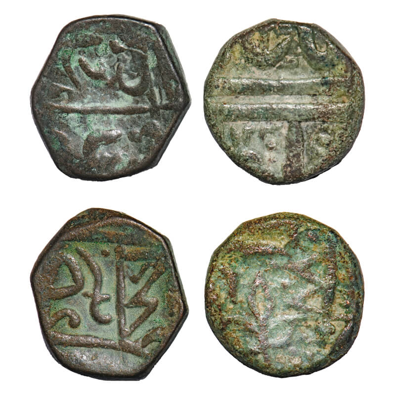 Nagpur Bhonsla Rajas, Copper Paisa (2 Coins), 14.10 & 15.25g, Raghuji II (AH 1186-1231/1772-1816 AD), Nagpur Mint, INO Ahmad Shah Bahadur and Shah Alam II ?, 1) do dandi type, AH 1230, double flag to left and different spear, 2) different type, double flag to left and sword, with obverse retrograde struck. P P Kulkarni Type Unlisted type. Very Fine+, Very Scarce. |