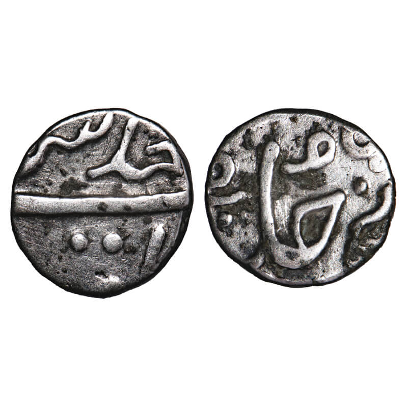 Bhonsla Rajas of Nagpur, Silver 1/8 Rupee/Zariputka Boota, 1.26g, Raghoji III (AH 1233-1270/1818-1853 AD), (Cuttak) Mint, INO Ahmad Shah Bahadur, 5(11) RY frozen, 'e' and dot mark, struck by DR gordon in 1825. PPK pg 175. Very Fine, Rare. |