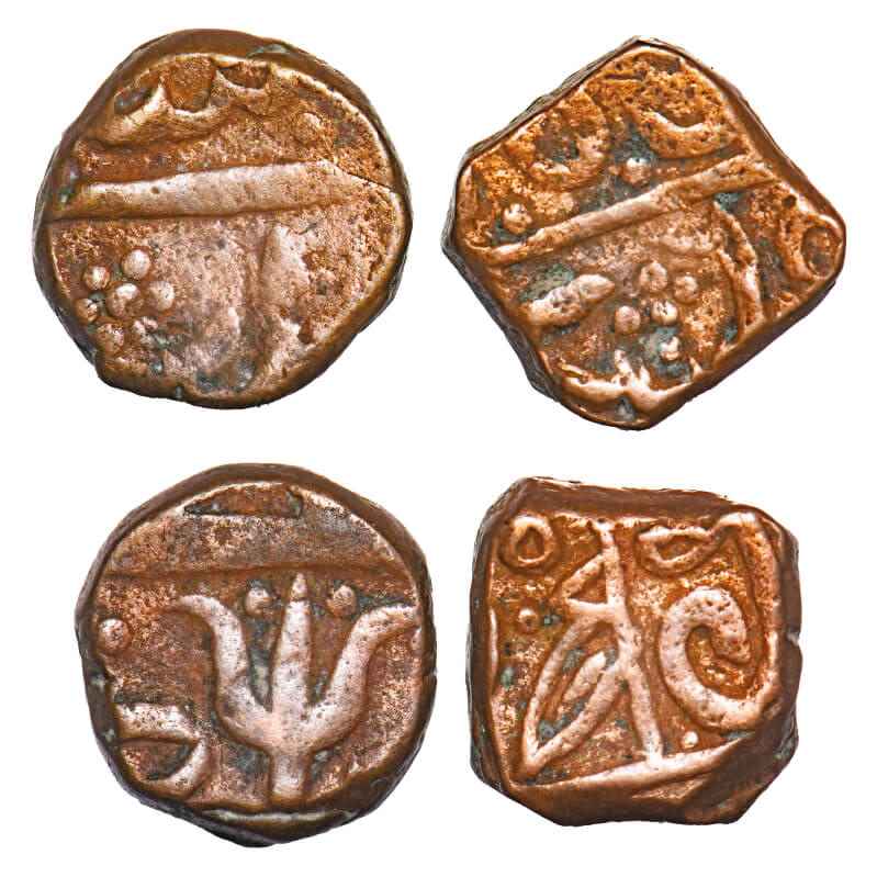 Nagpur Bhonsla Rajas, Copper Paisa (2 Coins), 15.91 & 16.66g, Raghuji III (AH 1233-1270/1818-1853 AD), INO Ahmad Shah Bahadur, 1) double flag to left, 2) Trident. P P Kulkarni unlisted type & 49.3. Very Fine+, Very Scarce.