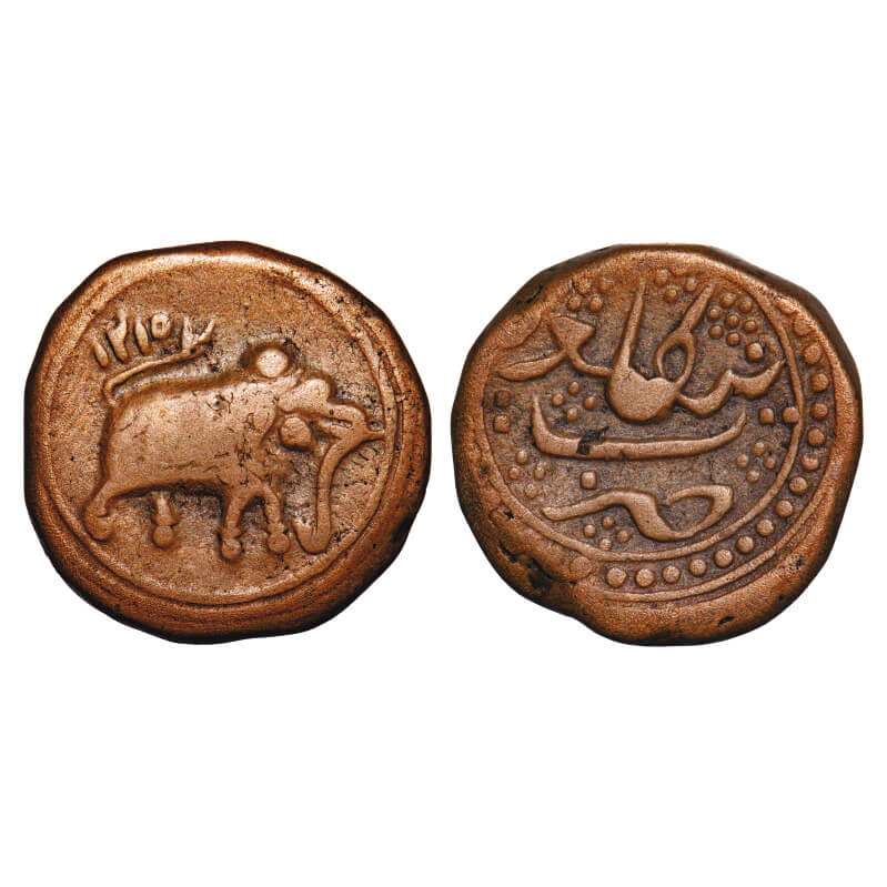 Mysore, Copper Paisa, 10.98g, Tipu Sultan, Bengalur Mint, AM 1215, Obv: Elephant towards right, uplifted tail & date above, within a plain double lined circle border, Rev: mint name within a field ornamented with dotted rosettes,with a border of double lined circles with a row of dots. KM 32.1 type/Henderson 354. Very Fine, Scarce. |
