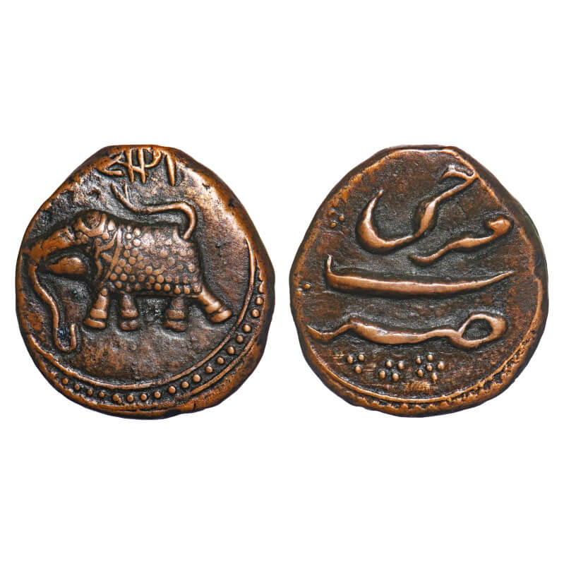 Mysore, Copper Paisa, 11.37g, Tipu Sultan, Farrukhi Mint, AH 1217 (retrograde), Obv: Elephant to the left with uplifted tail and date above with backward slash between 7 and 2 of date, Rev: Mint name with three ornamental rosettes in lower part of the field, additional two rosettes in left margin. within partial border of double lined circle within a row of dots on both sides. KM 53.2/Henderson 433. Very Fine, Scarce. |