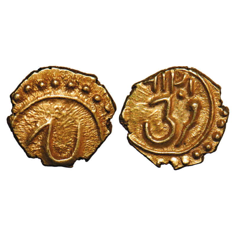 Mysore, Tipu Sultan, Gold Fanam, 0.37g, Farrukhi Mint, AM 1216 (Retrograde), Obv: Persian 'He', Rev: date & mint. KM 58/Henderson 426. Almost Uncirculated, Scarce. |