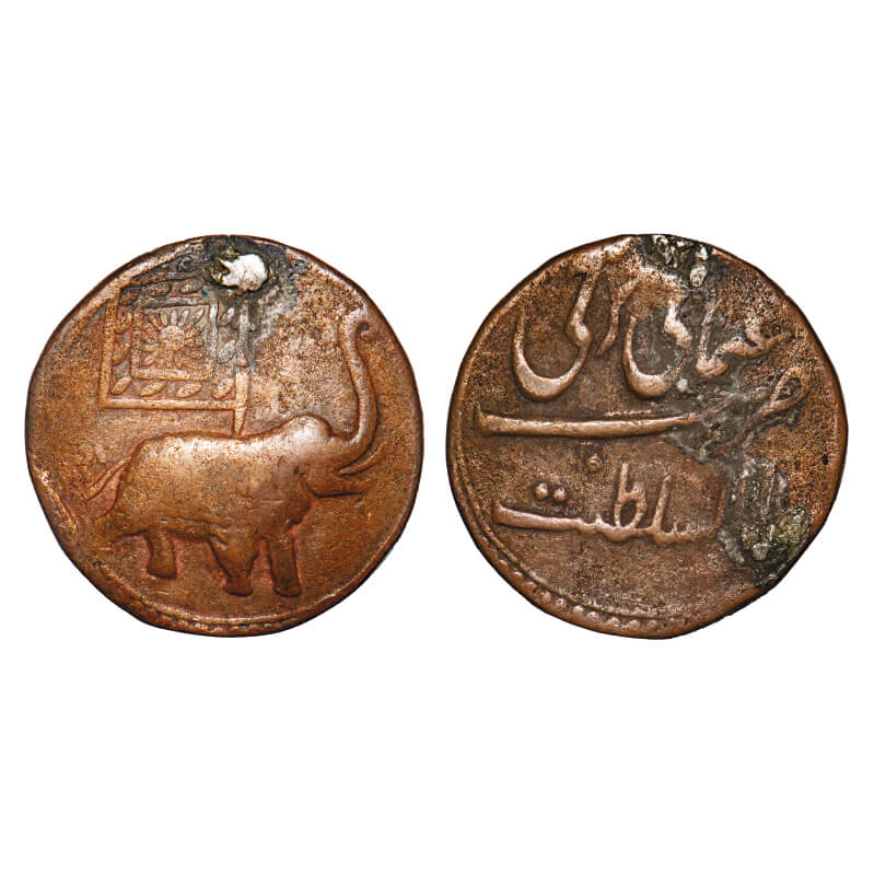 Mysore, Copper 2 Paisa, 21.27g, Tipu Sultan, Dar ul Sultanat Farrukhi Mint, AM 121(8) Retro, Obv: Flag above Elephant right with trunk uplifted and date above tail, Rev: Dar ul sultanat usmani Farukhi with rosset above usmani. KM 54/Henderson 429. Ex mount. About Very Fine, Very Rare. |