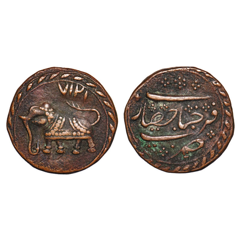 Mysore, Copper Paisa, 11.37g, Tipu Sultan, Farrukhyab Hisar Mint, AH 1217, Obv: Elephant to left with tail upraised and date above, Rev: Ornamental flowers and mint with with decorated borders on both sides. KM 63.1/Henderson 395. Very Fine+, Scarce. |