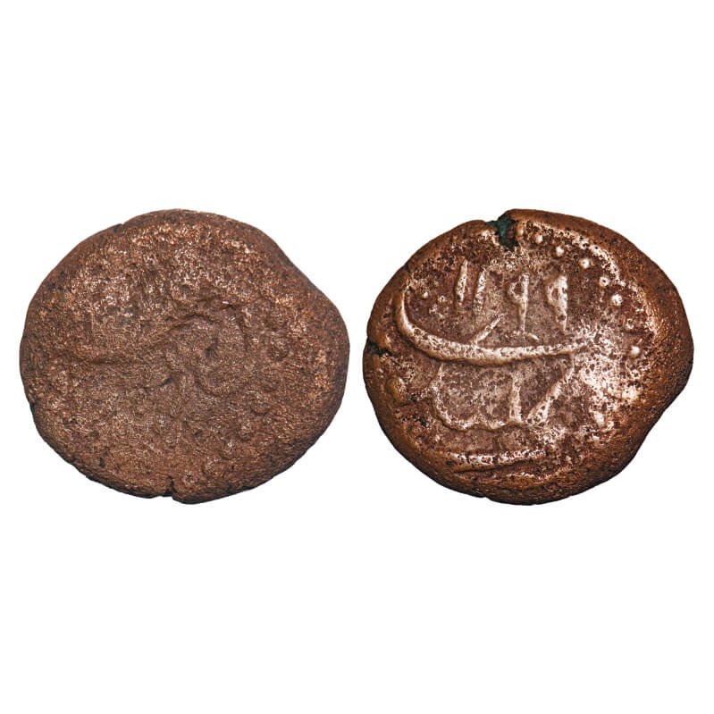 Mysore, Copper Paisa, 11.98g , Tipu Sultan, Kalikut Mint, AM 1199, Obv: Elephant towards right in a plain field, Rev: Date with four dotted rosette to left, underline, second 'ka' of kalikut crosses the underline above. dotted border on both sides partially visible. KM 72 type/Henderson 416. About Very Fine, Scarce. |