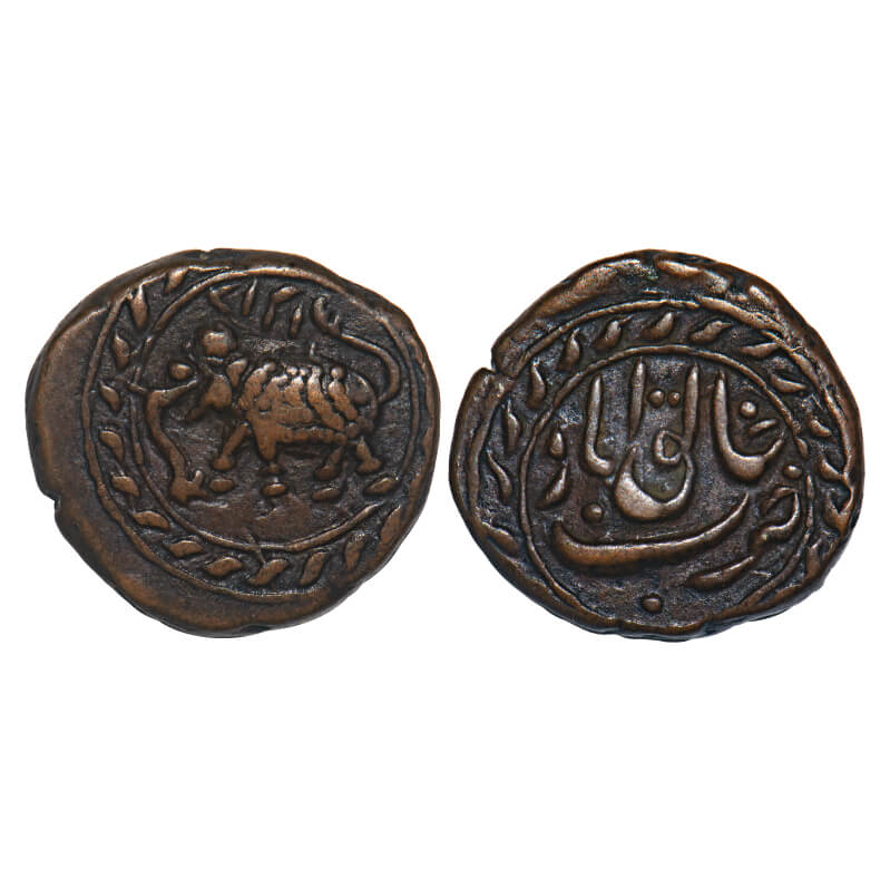 Mysore, Tipu Sultan, Copper ½ Paisa, 5.61g, Khaliqabad Mint, AM 1217, retro date above elephant towards left, beautiful borders (double lined circle with a row of thick oblique dashes) seen on both sides. KM 82/Henderson 455. About Exremely Fine, Rare. |