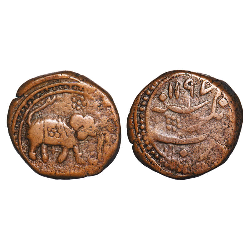 Mysore, Copper Paisa, 12.48g, Tipu Sultan, Nagar Mint, AM 1197, Obv: Elephant towards right, tail uplifted, Seven dotted ornamental rosette above head and on back variety, bell under abdomen, dot or rosette at tip of trunk , Rev: Mint name in a field with dotted rosettes, sanah (date) above. Double lined circled partial border with dots on boht sides, KM 103.2/Henderson 228. About Very Fine, Scarce. |