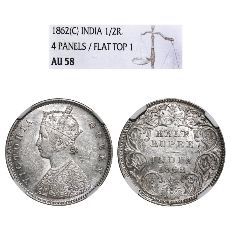 | Victoria Queen, Silver, Half Rupee, 1862, Calcutta Mint, A/I, 4 panels, Flat top 1, Round Pearls, With raised veins in centre of the petals. F. Prid 254. GK 370. NGC Slab AU 58. Very Scarce. |